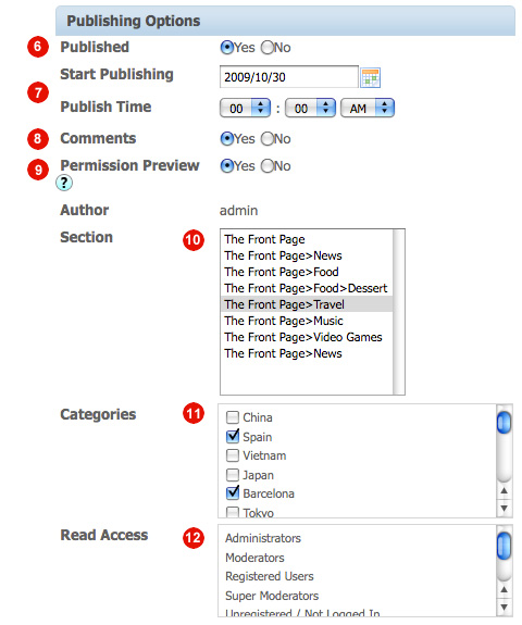 10. Sections: This displays the current section for this article. Clicking on different section will move the article to that section.