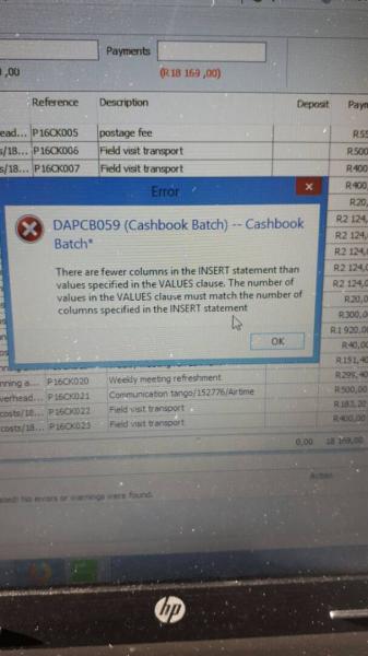Can someone please help interpret the error message I am receiving in Sage Evolution. I am processing transactions in the cashbook but receiving the attached error message. I have validated the batch and no errors found. However, when I save of try to post/update the batch I get that error message.