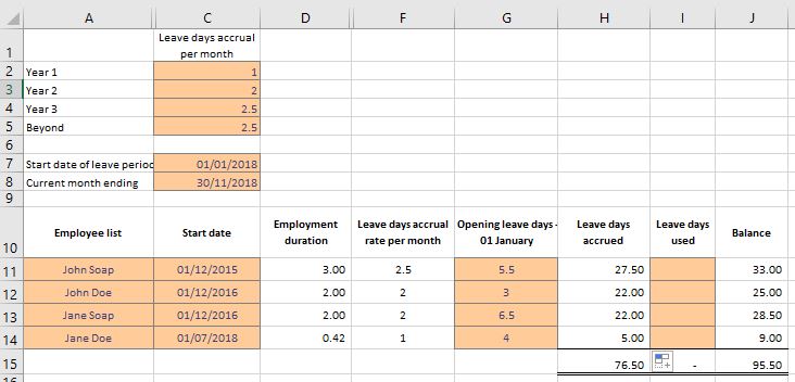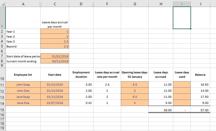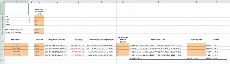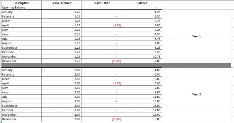 In the first year of service the employee gets 1 day per month, in the second year of service he gets 2 days per month, and in the third year of service he gets 2.5 days per month.