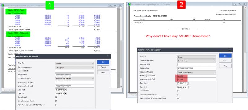 I'm trying to see all the purchases we have made using the inventory code "ZLUBE". In the attached screenshot, Report 1 works as it should. But for Report 2, surely I should see ZLUBE items in there? Is this perhaps a Pastel bug, or am I missing something?