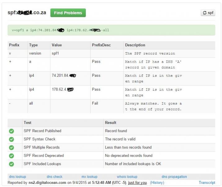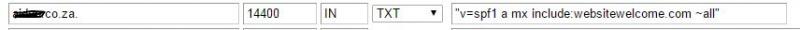 The above means that I've specifically allowed TWO IP addresses only to send mail from my domain. (the first one is my website server, generally automatically generated mails, and the second one is my hosted email account server). In order to figure these IP addresses out you will either know in advance as the hosting will usually show an IP address your site is hosted on, or you can look up the A record, or just run "ping yourcompany.co.za" in the command line and not the IP address, or you will have to send a test message and then view the FULL headers to work out the machine that originally sent the message. It's very important that you figure out all of the valid channels where emails can originate from your domain. Usually you're going to have at least one email account sending from your domain, as well as a website that would want to send from your domain. You may also have hosted mailing lists or third party websites that send email from your domain.