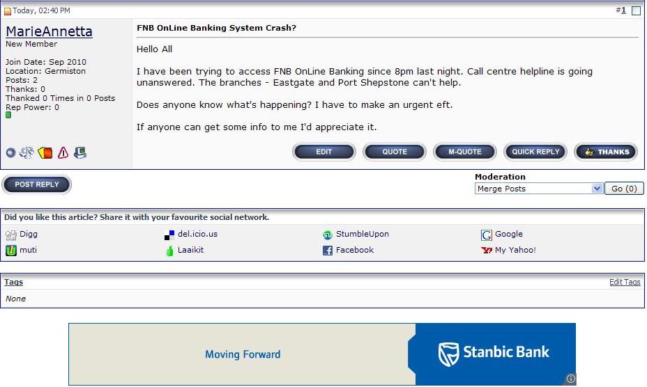 I have been trying to access FNB OnLine Banking since 8pm last night. Call centre helpline is going unanswered. The branches - Eastgate and Port Shepstone can't help.