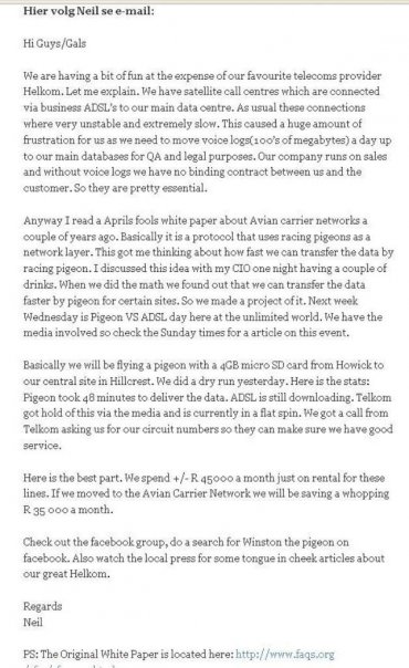 Yes we all hate telkom and have heard of "Helkom" , but now one intrepid techie is actually shaking Telkom by their gonads. This guy will prove that Telkom ADSL is no faster than 2000 year old messenger Technology: PIGEONS! (Excepting the flash disk of course)