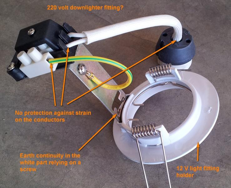 "Would you sign it off Murdock??? 220volt lamp in 12 volt fitting?? And why are wholesalers selling that kind of lamp holder? Surely that can't be right? (My local Voltex doesn't sell them any more except the ones with an earth tag, like anyone will bother to connect it)."