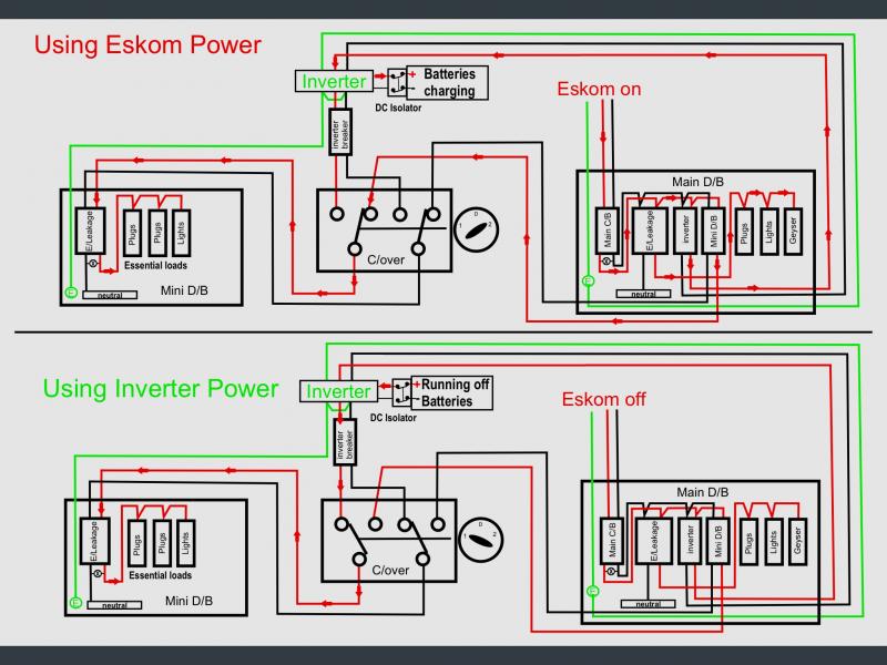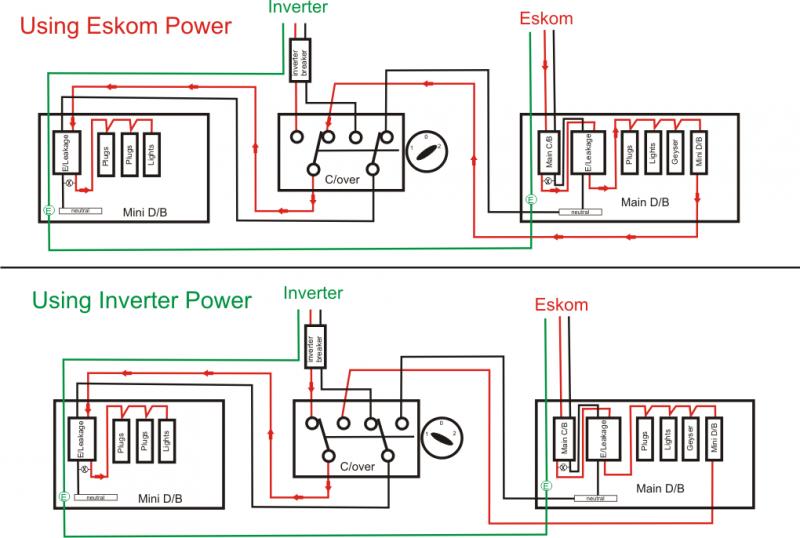 When the mains fails and the inverter kicks in, it too runs through the earth leakage, supplying the critical circuitry, which is usually the tv and router plug circuits and the fridge, and possibly a lighting circuit or 2 (obviously the inverter setup is spec'd correctly for the amount of load required to be run).