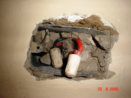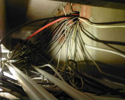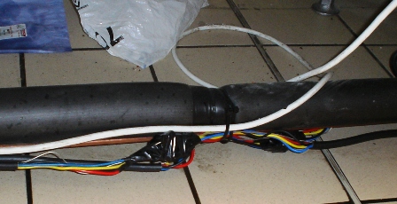 this picture looks harmless...where in fact this is one of the most dangerous pictures i have...this is a 3 phase 400 volt cable strap to a refrigeration pipe below a counter in a shop...the cable is joined together with connector blocks and taped up with insulation tape... so what is so bad about that you ask...well the firstly it is on the ground the joint are not ip65 which means that when the people working here get the mop and start cleaning...the joints are submersed in water... how someone hasnt been electricuted here yet i am still puzzled...the only explaination i have is that when they clean... the motors are not running or they are standing in gum boots cleaning.