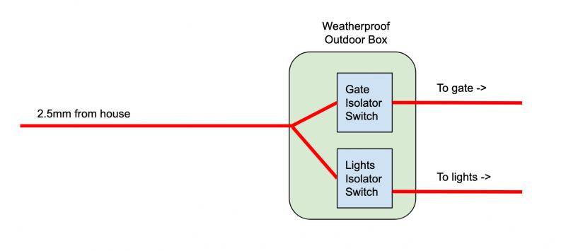 I need to get power to my gate for a gate motor, but at the same time want to have lights on in front as well. My understanding is that mixed circuits are ok provided that they are marked accordingly.