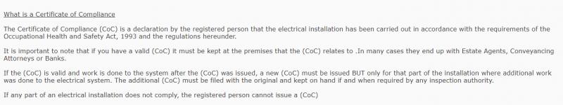 I stay in a complex. They cover building insurance. i have been quoted by someone for a small solar installation - I now have doubts that they are registered electrical contractors. However, they supply a legit COC from an electrician that insurance would accept. I saw the certificate....it expires next month....registered to someone else from another company.