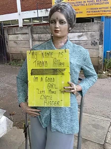 This mannequin has been standing in front of this shop for years, near the bottom of Longmarket on the left. The owner places it there every morning, I see they have it chained up lately. The shop is a small general dealer/take away