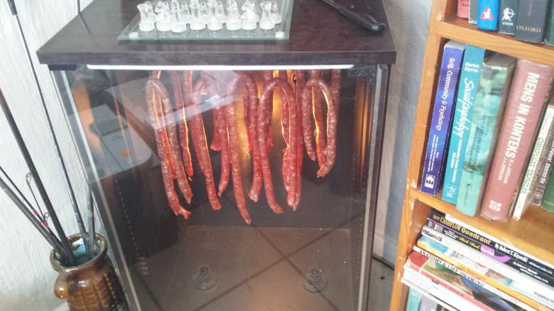 I made my cabinet from an old melamine counter top, 1100 x 400 x 400 mm, 60 watt lamp in the bottom with air intake holes with filters around the lamp area, above that a perforated shelf with filters, then a slightly smaller drip tray shelf, hangers at the top made from old 6mm threaded rod with paperclip hooks for the meat, the top lid has a computer fan to draw all the air up and out.