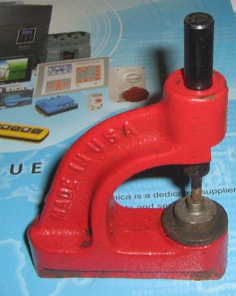 It's a bench top riveter. It was primarily sold for replacing the lining on brake shoes for cars. The picture I posted actually shows the thing configured for removing the old rivets before the new lining is fitted. It has a different die for compressing and forming the new copper or brass rivets during reassembly.