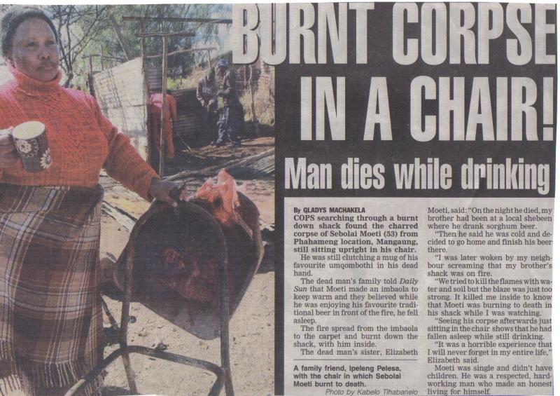 “On the night he died my brother had been at a local shebeen where he drank sorhum beer. Then he said he was cold and decided to go home and finish his beer there. Seeing his corpse afterwards just sitting in his chair shows that he had fallen asleep while still drinking.”