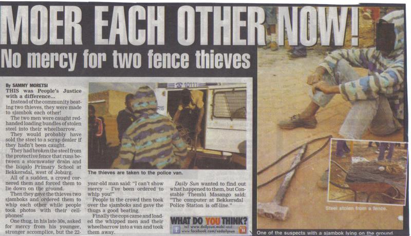 1. In South Africa mob justice is not uncommon. Yes, it’s unlawful to take the law into your own hands and in doing so you commit a criminal offense. I don’t condone violence or any unlawful activity. We used to a situation where people living in informal settlements engage in kangaroo courts in which they either beat and/or kill the alleged thief or law breaker;
