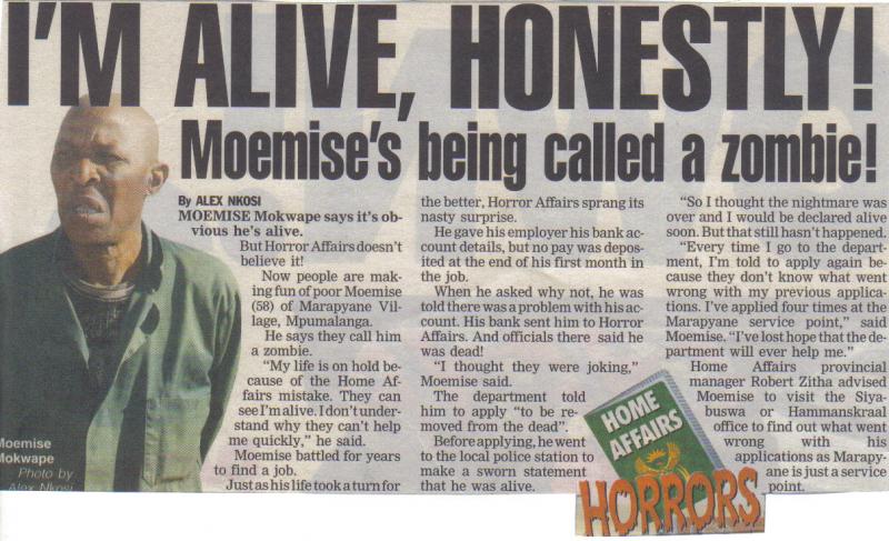 Poor Moemise Mokwape, clearly alive and well, finally got his dream job. He worked diligently for an entire month and like all employees went to draw his money at the end of the month. BUT No money there to draw! WHY?? According to Home Affairs he’s dead!