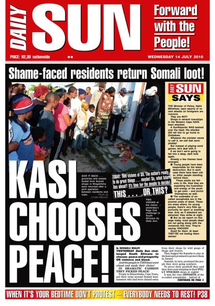 I remember this ‘Kasi’ chooses peace, shame faced residents return Somali loot,” article very clearly as it was released during the world cup period. I asked many of my Black friends whether they took offence to the use of the word ‘Kasi,’ in this articles. The vast majority of them said no and further that they approved of it’s use in this particular context of an informal settlement’s residents returning stolen goods to its’ foreign national’s owner. It is for this reason that I say that they daily Sun could read the mood of the vast majority of South Africans at that time and furthermore that no matter how the daily Sun uses certain apartheid era terms, the Daily Sun reader takes no offence!