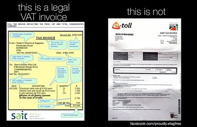 >The South African Revenue Service will not accept e-toll invoices rendered by Sanral